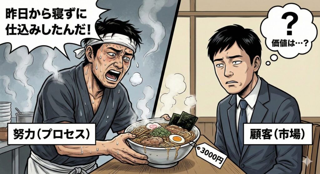 あなたは「寝ずに頑張ったから」といって3000円払いますか? 払わないですよね。二度と行かないはずです。 あなたが払うのは「ラーメンの味(価値)」に対してであって、店主の「苦労」に対してじゃないからです。